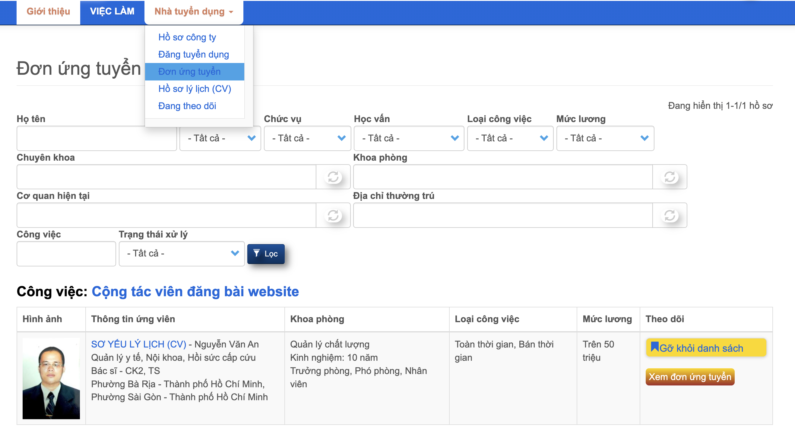 Nếu có Ứng viên tham gia ứng tuyển, bạn sẽ thấy danh sách các Đơn ứng tuyển và thông tin Ứng viên.