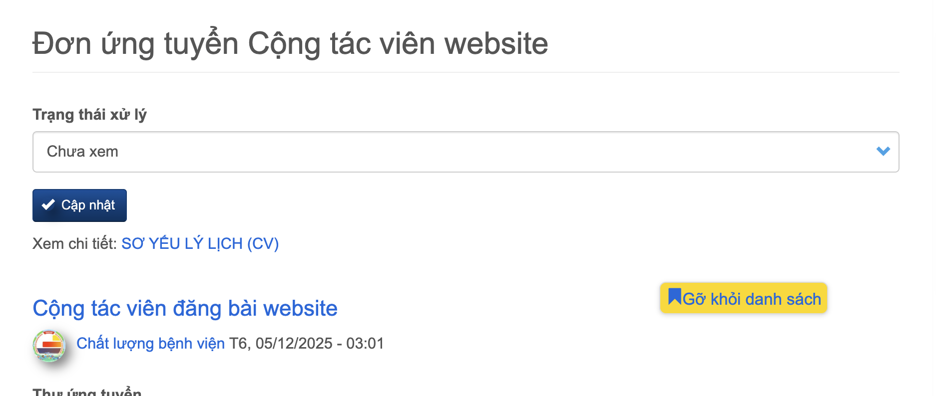 Bạn có thể xem thư ứng tuyển: click vào "Xem đơn ứng tuyển". Bạn có thể cập nhật trạng thái xử lý đơn ứng tuyển.