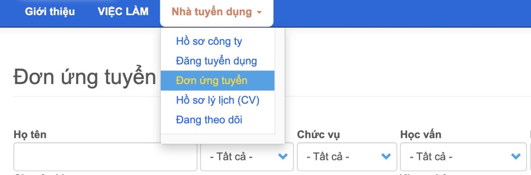 Từ menu click "Nhà tuyển dụng" --> "Đơn ứng tuyển"