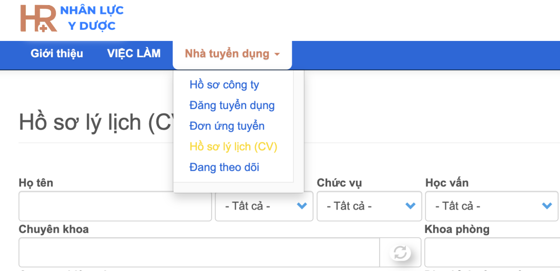 Từ menu, click "Nhà tuyển dụng" --> "Hồ sơ lý lịch (CV)".