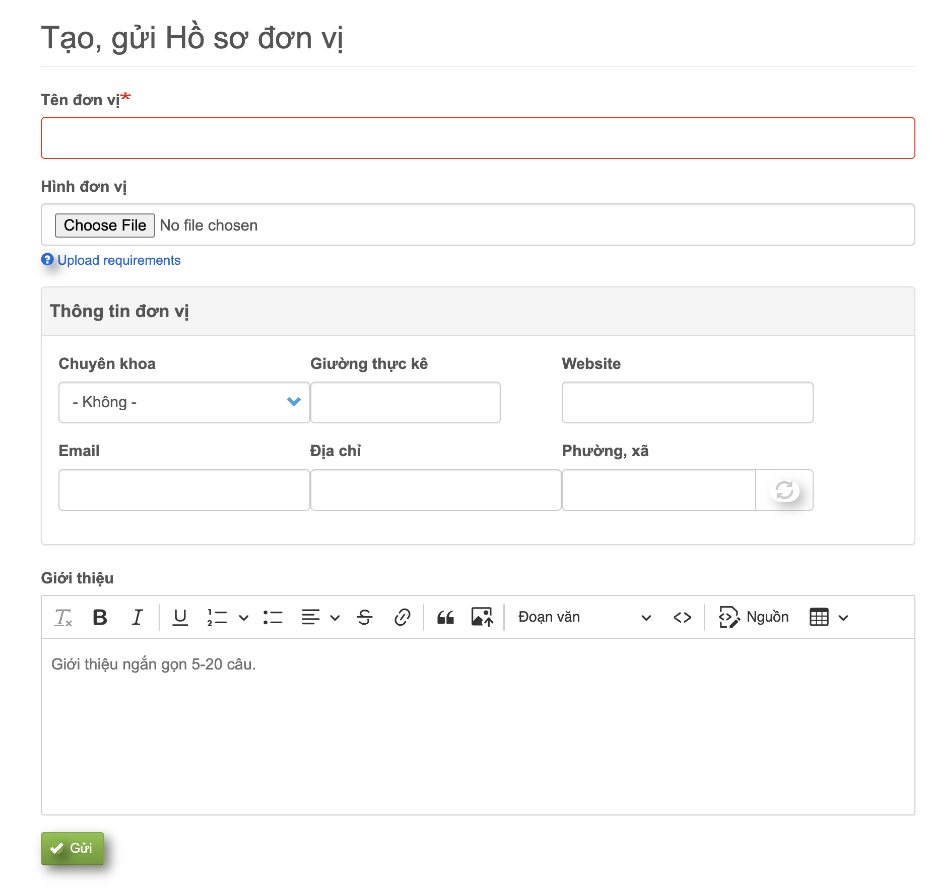 Sau khi click vào "Tạo Hồ sơ công ty", bạn sẽ vào form điền thông tin. Hãy điền đầy đủ, sau đó ấn "Gửi".